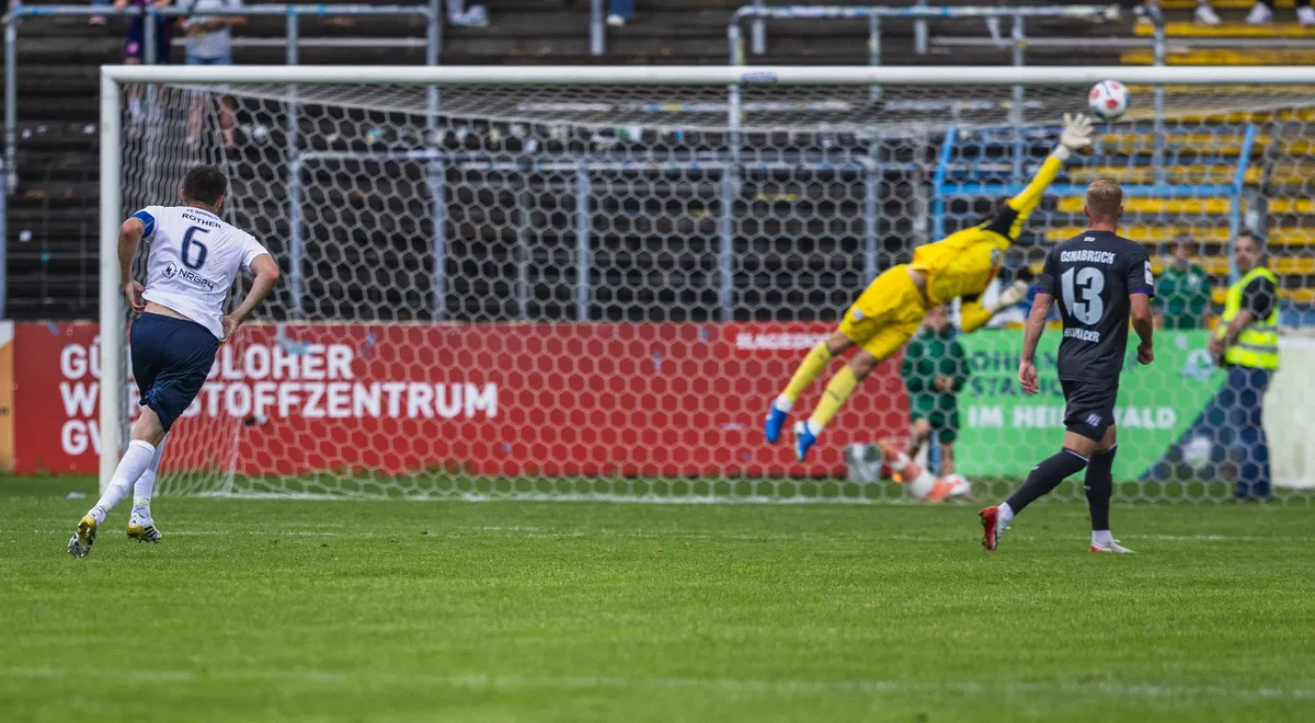 Viel Pech hatte der FCG in der 32. Minute: Fynn Arkenberg bekam aus kurzer Distanz den Ball an den angelegten Arm geschossen, der Referee entschied auf Strafstoß. Lars Kehl verwandelte sicher zum 1:0 für den VfL Osnabrück. Doch die Gütersloher arbeiteten sich zurück ins Spiel. Auffälligster Offensivakteur war Luis Frieling, der dann auch der Torschütze zum 1:1 war. Den Treffer bereitete er mit einem guten Lauf auf der rechten Seite selbst vor. Seine Hereingabe wehrte VfL-Torwart Niklas Sauter zwar ab, doch der Ball landete wieder bei Frieling, der aus spitzem Winkel den Ausgleich erzielte. Mit einem Traumtor aus mehr als 20 Metern schoss der neue FCG-Kapitän Björn Rother dann das 2:1 für die Dalkestädter. Allein dieser Treffer war das Eintrittsgeld wert. Die Kugel landete genau im Knick - für die Gütersloher auf jeden Fall das Tor des Monats Juli.