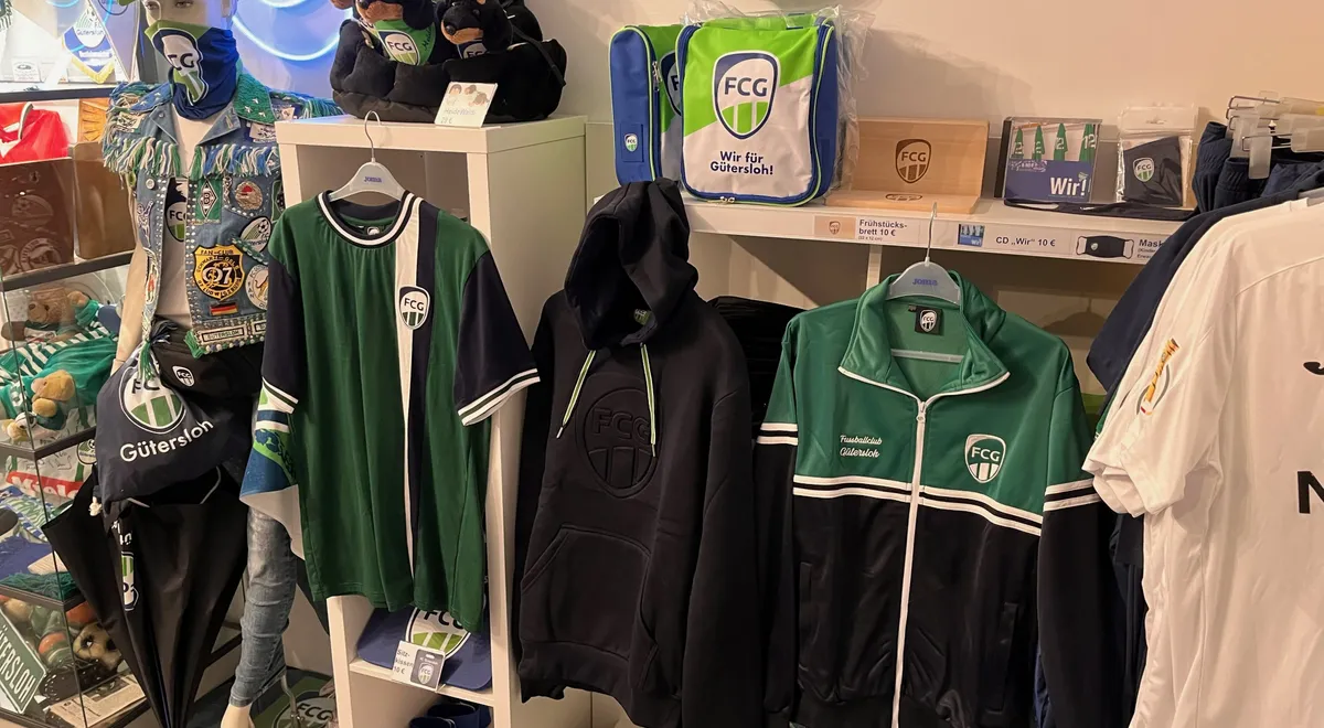 Ob vor dem Anpfiff, in der Halbzeitpause oder nach dem Spiel – der Fanshop des FC Gütersloh hinter der Sitztribüne ist eure erste Adresse für alles, was das FCG-Herz höherschlagen lässt!