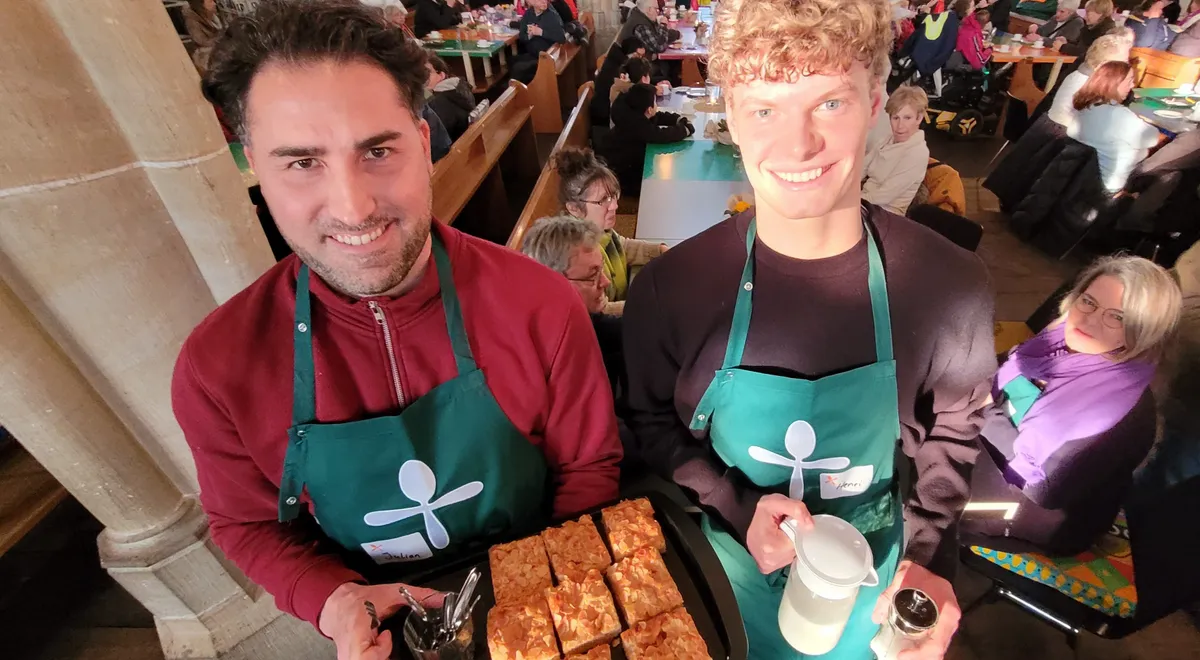 Das Regionalliga-Team des FC Gütersloh engagiert sich bei der Gütersloher Vesperkirche. Trainer Julian Hesse und Henri Bollmann servierten am Sonntagnachmittag Kaffee und Kuchen. Mit dabei waren auch Lennard Rolf und Nico Tübing. Logischerweise waren sie auf ihren Beinen flink unterwegs und leisteten vorzüglichen Service. "Super-Sache", sagte Julian Hesse, "nächstes Jahr wollen wir versuchen, mit der ganzen Mannschaft zu kommen." Der FCG stünde damit in Tradition solcher Klubs wie VfB Stuttgart, deren Bundesliga-Team seit Jahren Stammhelfer bei der Vesperkirche Stuttgart ist.