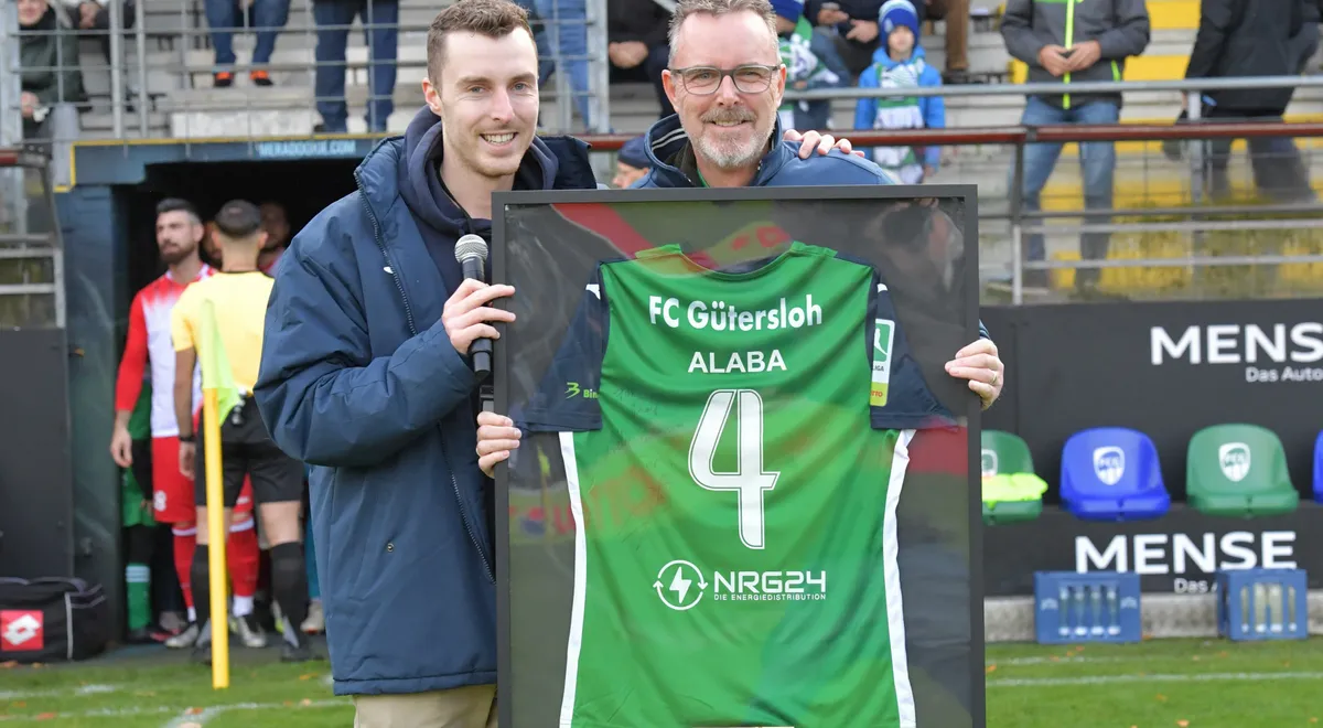 Sein Sohn Marcel ist seit vielen Jahren ebenfalls unser Stadionsprecher und hat ihm vor dem Heimspiel gegen die Sportfreunde Siegen als Dankeschön ein FCG-Trikot mit Originalunterschrift und persönlicher Widmung von David Alaba überreicht.