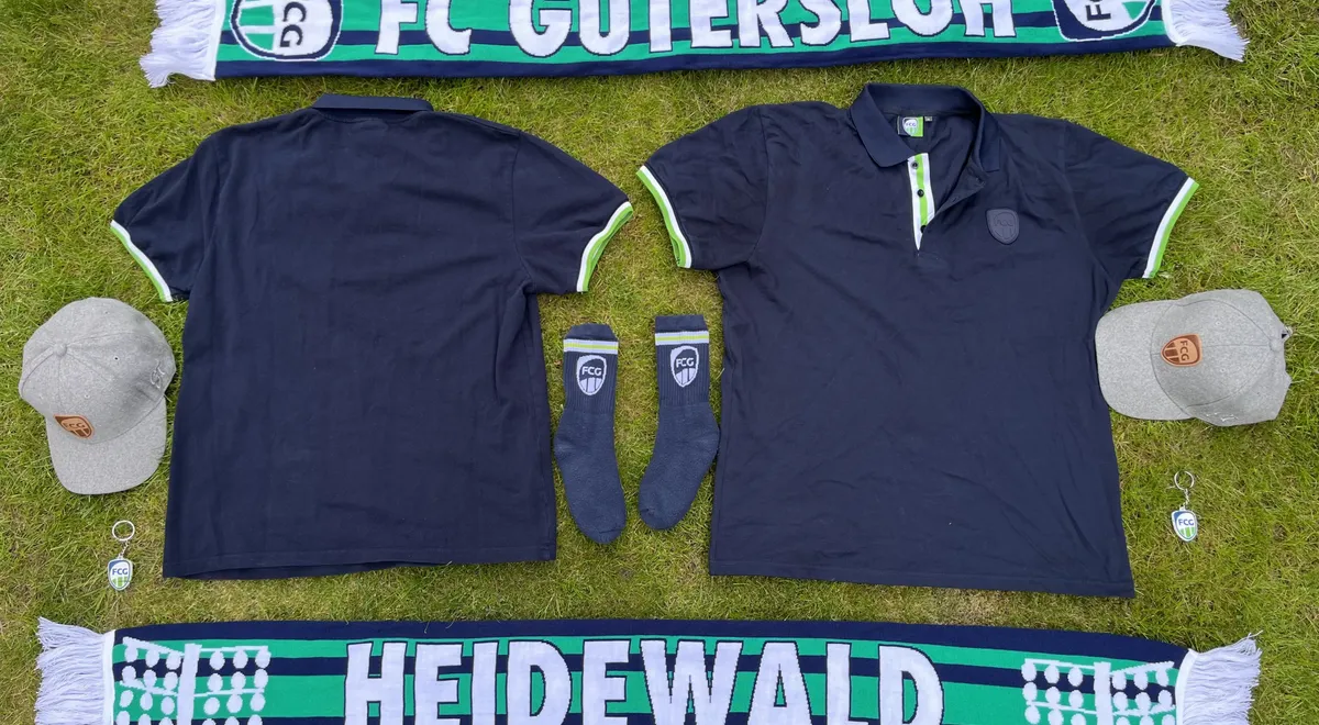 Bereits beim letzten Spiel gegen Paderborn vorgestellt, aber bereits in der Halbzeitpause ausverkauft war unser neuer „HEIDEWALD“ Schal. Der Schal hat zwei verschiedene Seiten: Einmal unsere Wappen und der FC GÜTERSLOH Schriftzug und einmal unsere ikonischen Flutlichter, welche den HEIDEWALD einrahmen. Der Schal kostet 15 €. Er ist komplett in Vereinsfarben gehalten und mit 20 cm Breite extra groß und nun wieder im Fanshop verfügbar. Abgerundet werden unsere Neuheiten durch Socken in dunkelblau für 9 €. Erhältlich in den Größen 39 – 42 und 42 – 45. Mit weißem Wappen und weiß-grün-weißem Streifen. Außerdem durch einen neuen „Rubber“-Schlüsselanhänger für 5 €. Damit tragt ihr unser Wappen in Farbe immer bei euch.