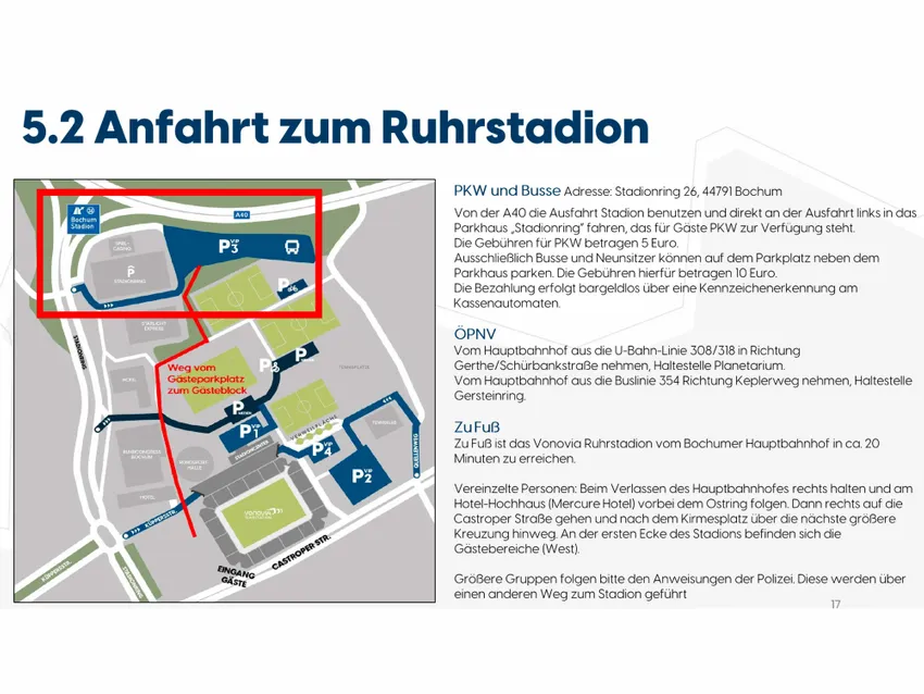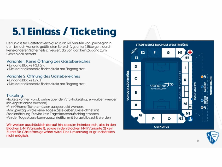 Der Einlass für Gästefans erfolgt i.d.R. ab 60 Minuten vor Spielbeginn in geöffneten Bereich E2 / F. Bitte geht durch keine anderen Sicherheitsschleusen, da von dort kein Zugang zum Gästeblock besteht. Die Materialkontrolle findet direkt am Eingang statt.