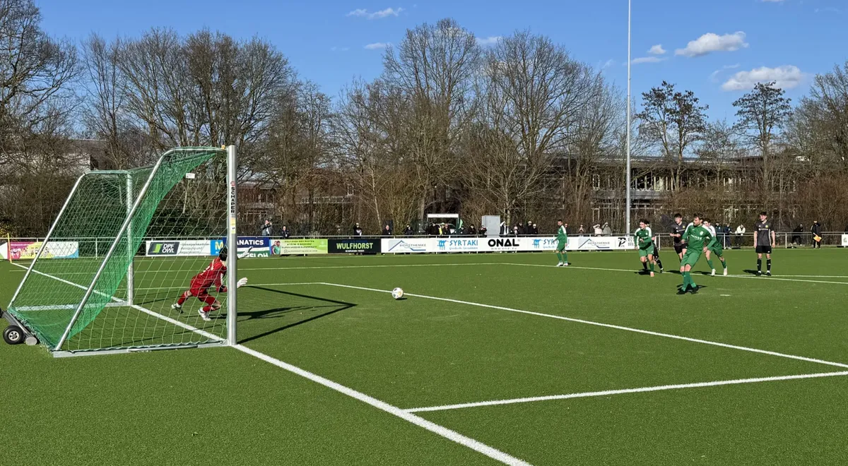 Auf dem Foto: Jannis Flaskamp verlädt den gegnerischen Torwart und verwandelt den Elfmeter zum 1:0.