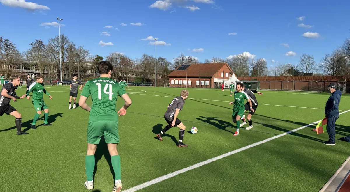Da Trainer Dirk van der Ven erkrankt fehlte, wurde das Team allein von Trainer Jakob Simon gecoacht. „Wir haben eine unglaublich gute erste Halbzeit gespielt“, berichtete Teammanager Patrick Grimm. Julian Aistermann brachte den FCG durch einen verwandelten Elfmeter von Führung (20.). Nach einem sehenswerten Doppelpass von „Jule“ und Michel Akay legte Jonathan Dalmis den zweiten Treffer nach (36.). Kurz vor der Pause nutzte Bielefeld einen Gütersloher Fehler zum Anschlusstreffer, was das Spiel in der zweiten Hälfte noch einmal spannend machte. Nach dem Seitenwechsel ging's richtig zur Sache, aber die Zweite brachte die 2:1-Führung erfolgreich nach Hause.