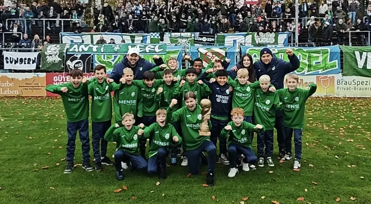 Die E1-Junioren der vergangenen Saison haben den Strenge-Cup nach 21 Jahren wieder in den Heidewald geholt – und jetzt haben sie ihn auch dort präsentiert. Das Team von Shane Biddle, Elmedina Gashi und Eduard Latosik wurde in der Halbzeitpause des Regionalliga-Heimspiels vor 1.800 Fans gegen den Wuppertaler SV gefeiert und lief eine Ehrenrunde.